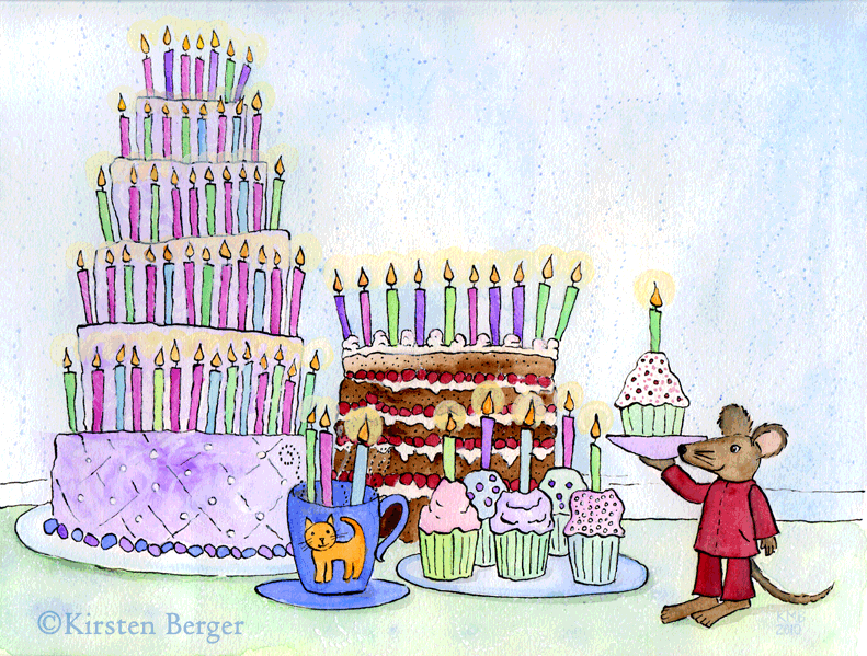 The first thing that came to mind for "Layers" was a cake with many layers. Then I remembered I had an image on hand for this. I made this last year for the invitation to my father's 70th birthday party. The mouse in the red jogging suit is a character in stories my father used to make up for us. Celebrations with my family always involve many cakes so it wouldn't do to show just one. And yes, there are 70 candles!